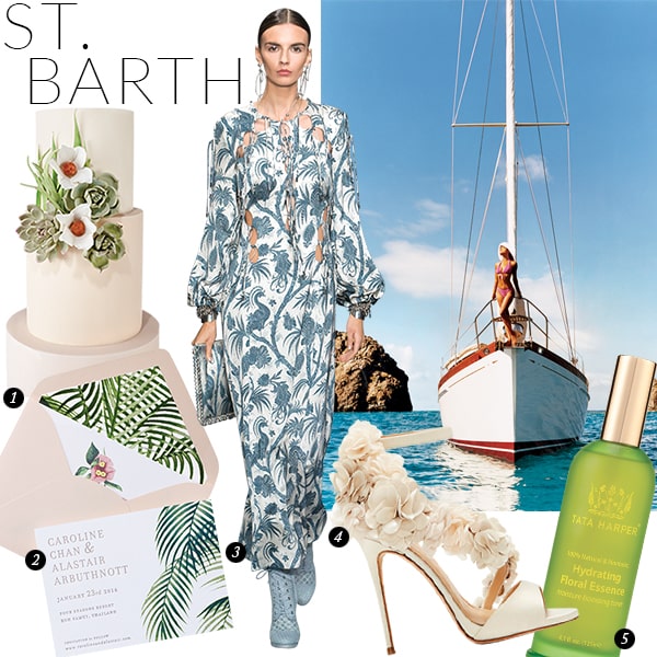 1. Wedding cake, $18.50 per slice, Earth and Sugar; 2. “Tropical Wedding” invitation, $900 for 100, Paper & Type; 3. Blue-printed maxi dress, price upon request, Monse; 4. Shoes, $195, Imagine Vince Camuto; 5. “Hydrating Floral Essence” skincare oil, $89, Tata Harper